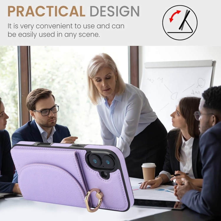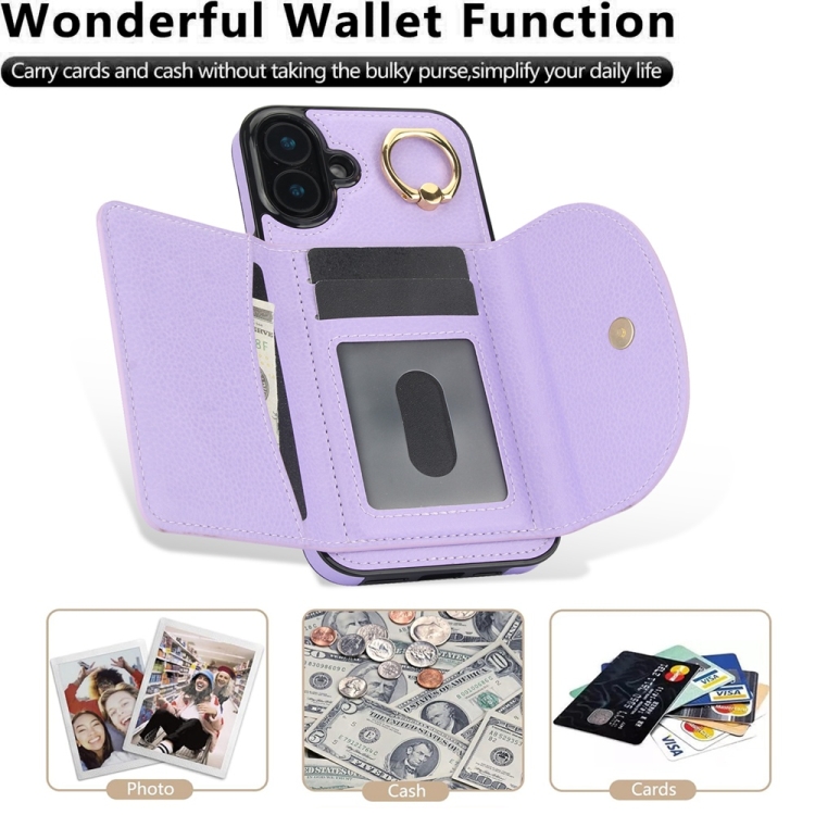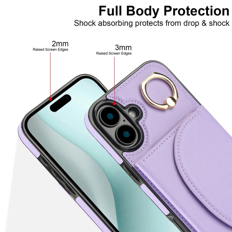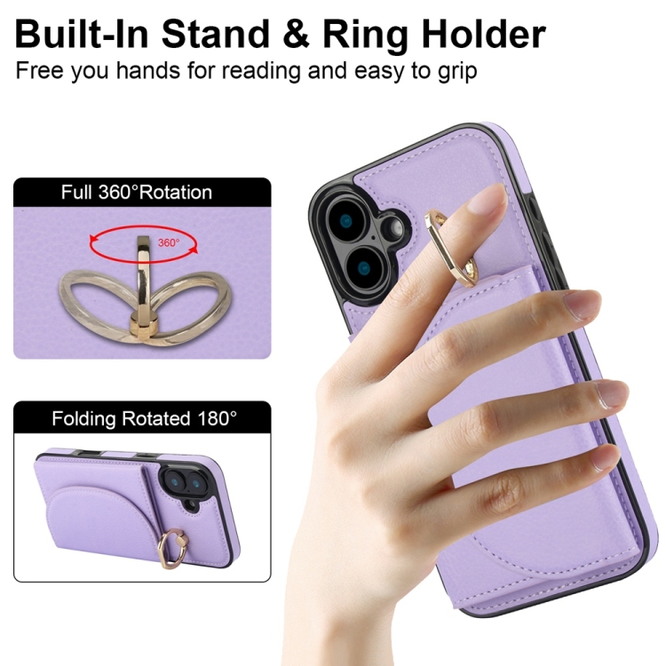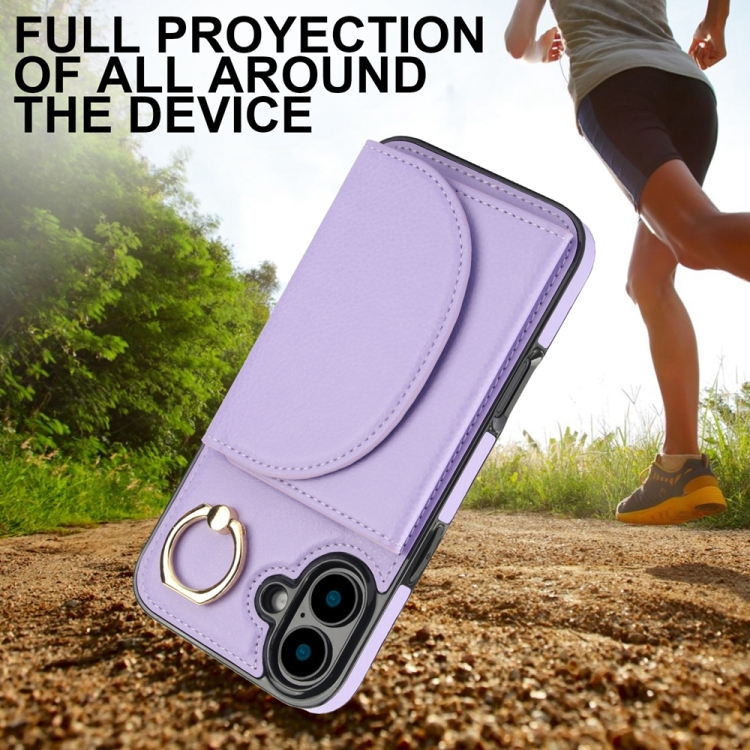 Funda para iPhone 16 Plus Ym007 con tarjetero y anillo, tacto suave (Morado)