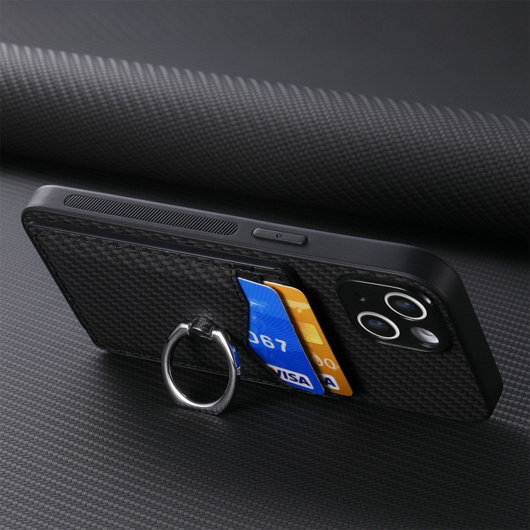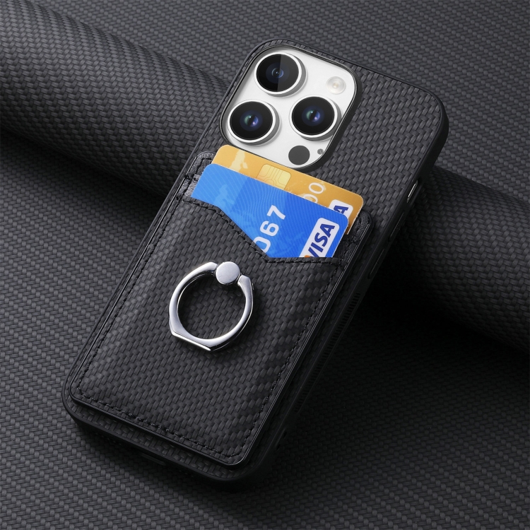 Funda para Teléfono iPhone 16 Pro con Anillo Tipo Billetera y Tarjetero Fibra de Carbono (Negra)