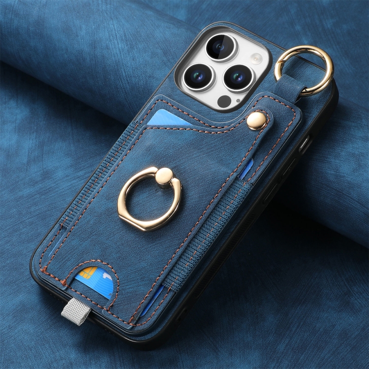 Funda para Teléfono iPhone 16 Pro con Anillo y Tarjetero Estilo Retro con Asa (Azul)