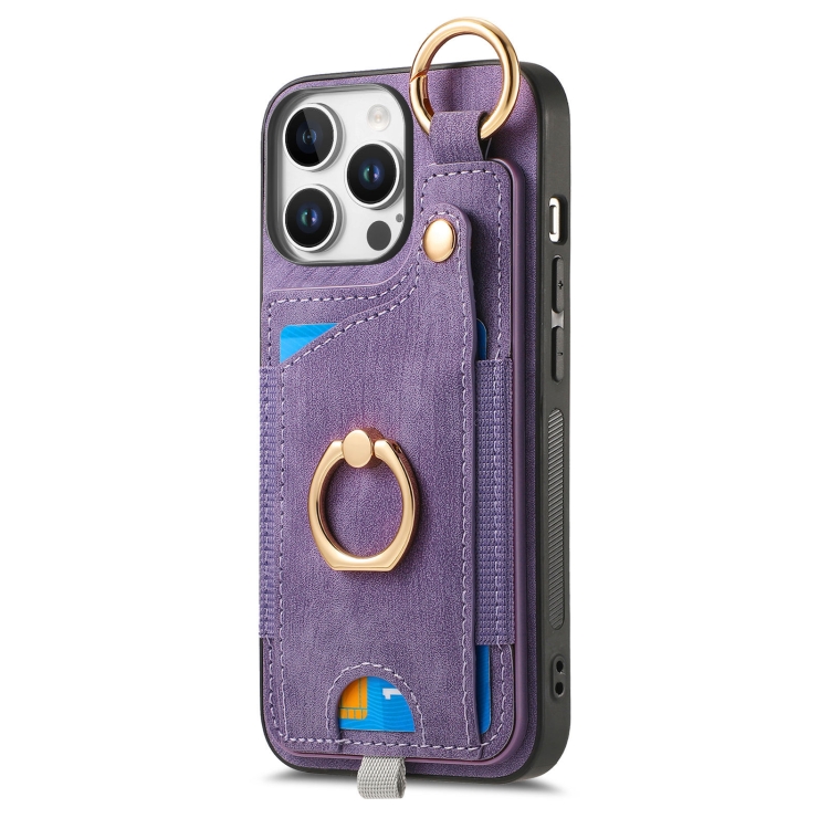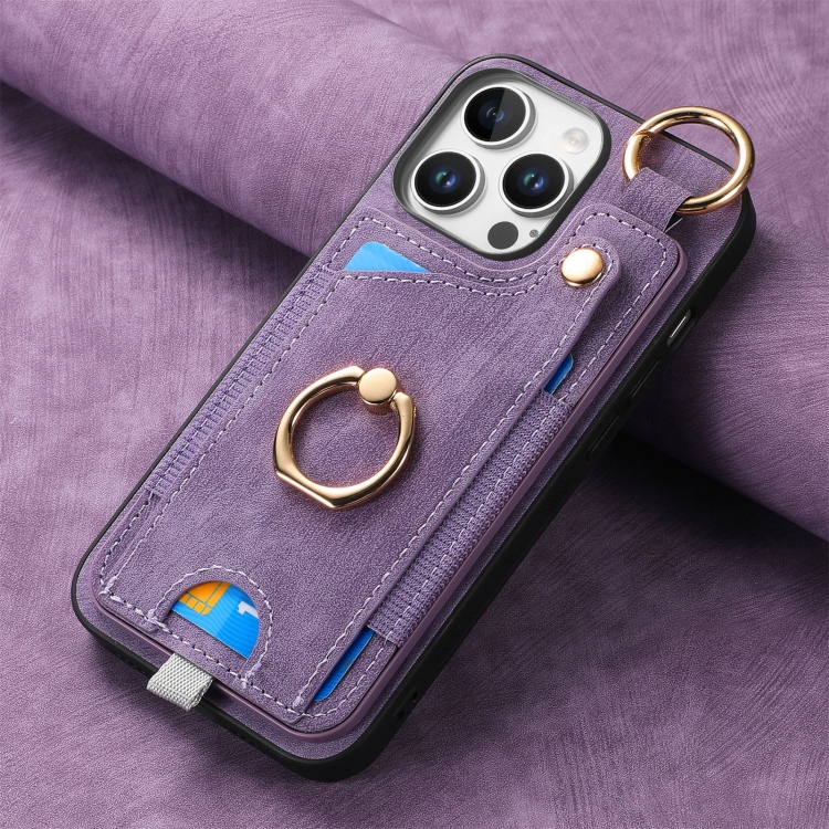 Funda para Teléfono iPhone 16 Pro con Anillo Tarjetero Asa Estilo Retro (Morado)
