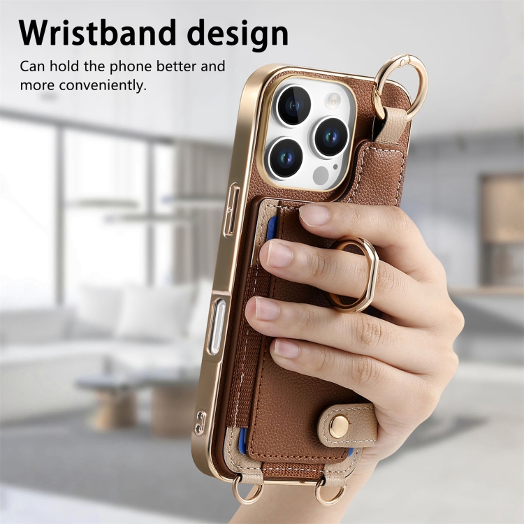 Funda para Teléfono iPhone 16 Pro con Anillo y Tarjetero con Lazo para Colgar (Marrón)