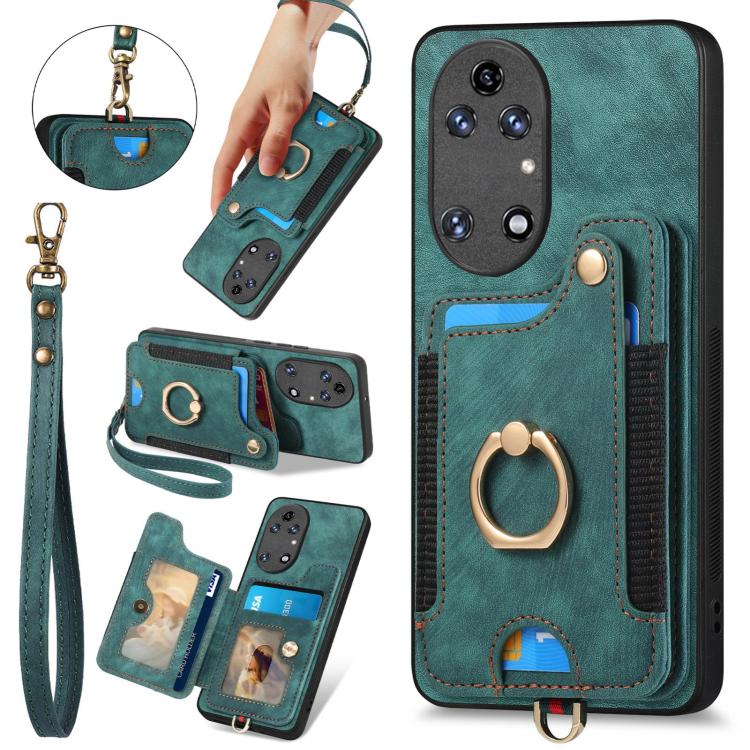 Funda para Teléfono Huawei P50 con Billetera MultiTarjeta, Diseño Retro y Anillo (Verde)