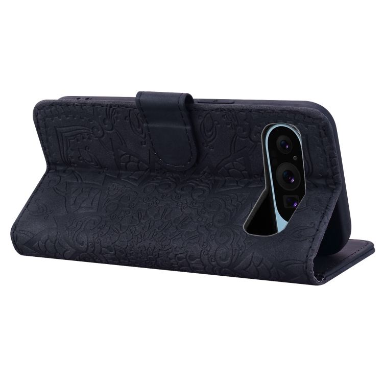 Funda para Teléfono Google Pixel 9 Pro XL Doble Pliegue Piel de Becerro Relieve Mandala (Negra)