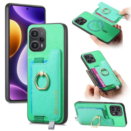 Funda para Teléfono con TaRJetero y Anillo de Cuero con Diseño Retro Magsafe Cross para Redmi Note 12 Turbo/Poco F5 5G (Verde)
