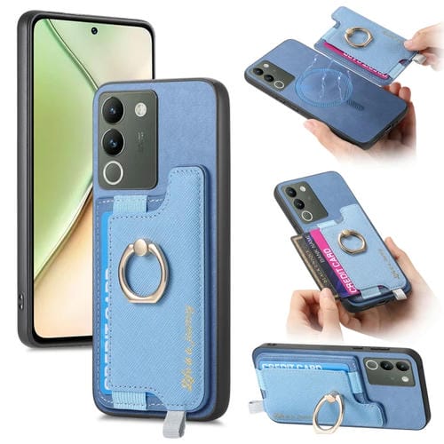 Funda para Teléfono con TaRJetero y Anillo de Cuero con Diseño Retro Magsafe Cross para Vivo Y200/V29E (Azul)