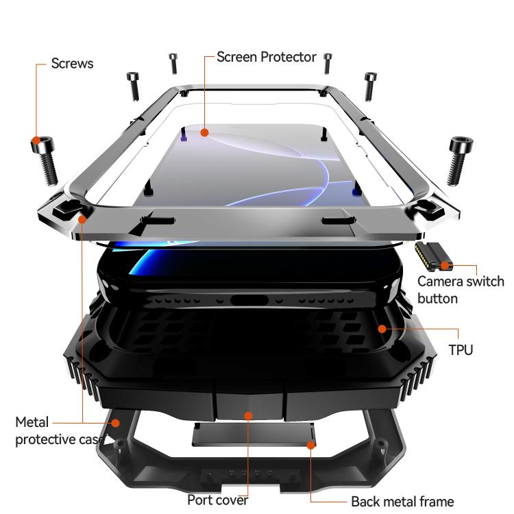 Funda R-JUST de metal, silicona y vidrio templado para iPhone 17 Pro, resistente al agua y con soporte (plateada)