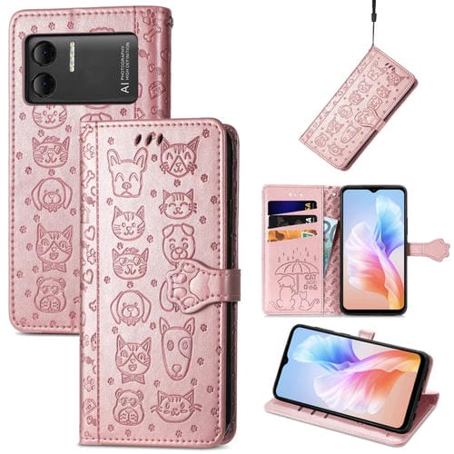 Funda de Cuero para Doogee X98 Pro y X98 con Relieve de Gatos y Perros (Oro Rosa)