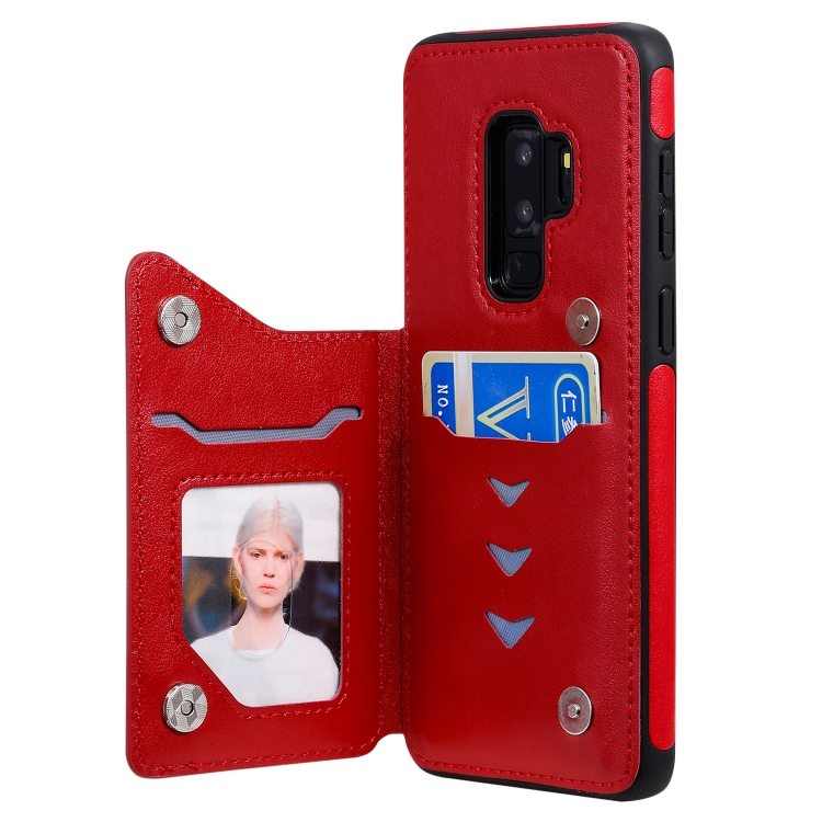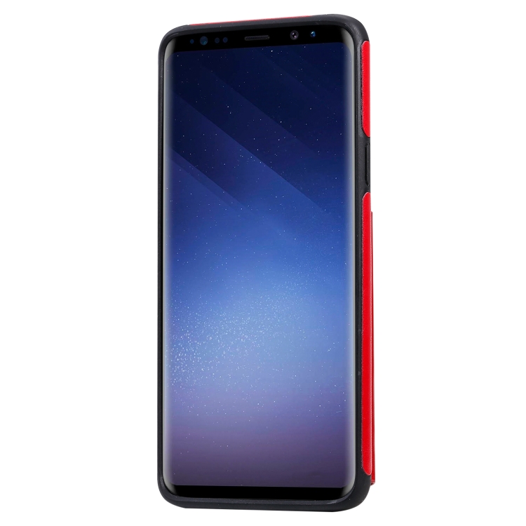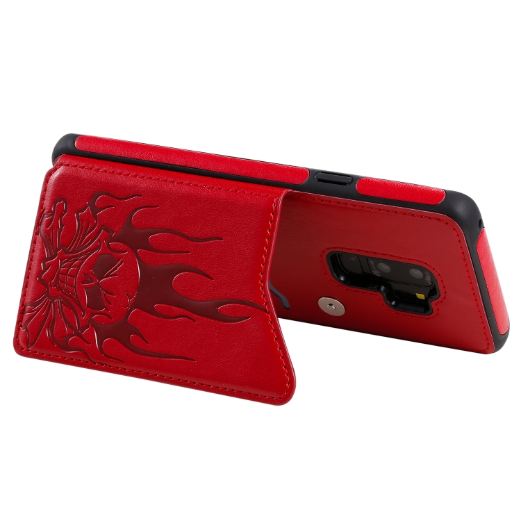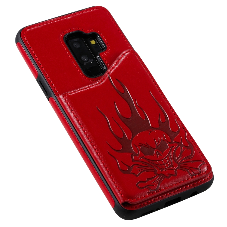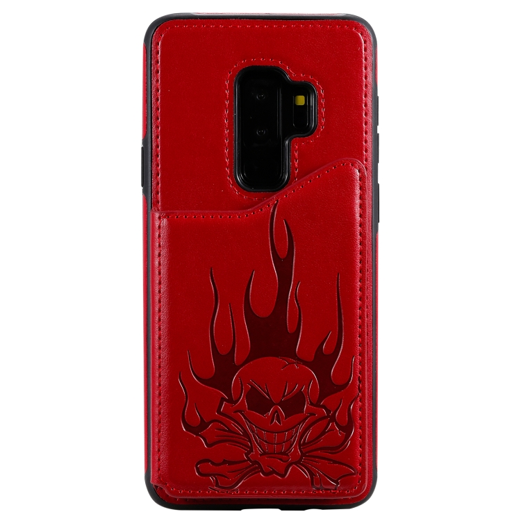 Estuche protector Galaxy S9 + Patrón Cráneo Estampado En Relieve a Prueba de Golpes con Soporte y Ranuras para Tarjetas y Billetera (Rojo)