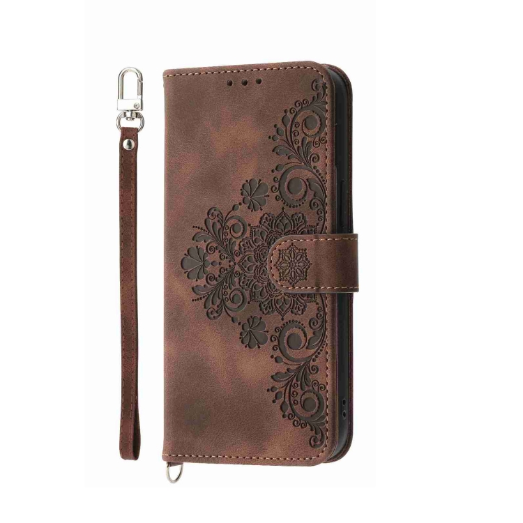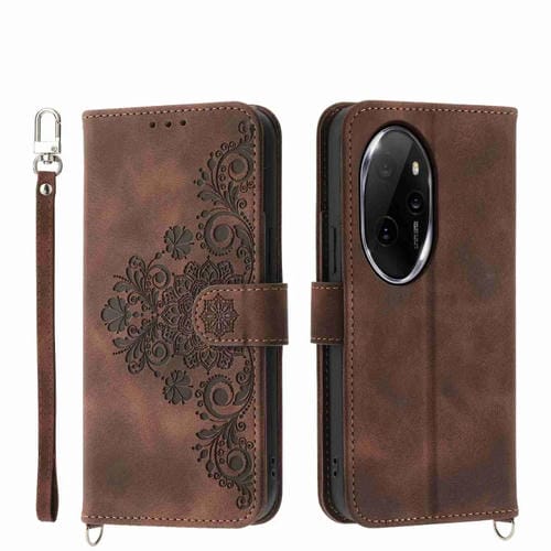 Funda de Cuero para Honor 100 Pro con Billetera, Relieve y Flores, Tacto de Piel (Marrón)