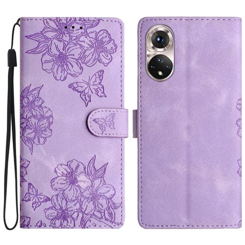 Funda para Honor 50 de PU con Sensación de Piel Mariposa y Flor de Cerezo en Relieve (Púrpura)