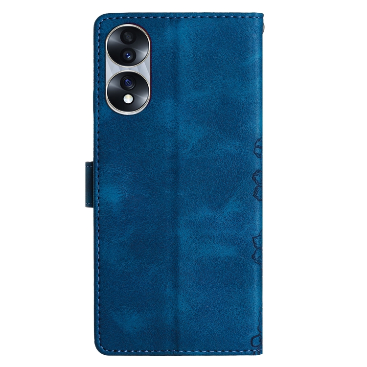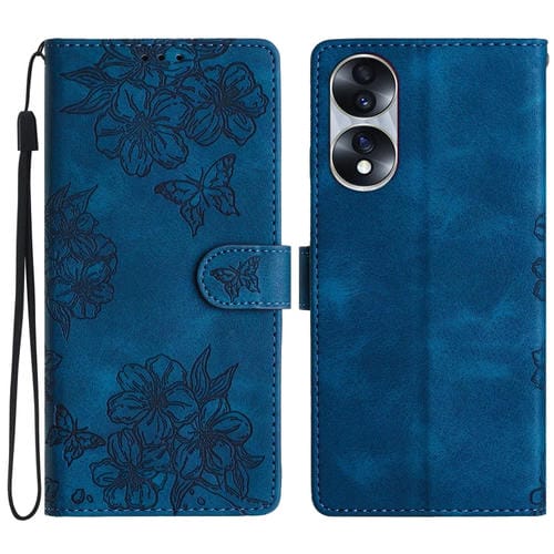 Funda para Honor 70 de PU con Sensación de Piel Mariposa y Flor de Cerezo en Relieve (Azul)