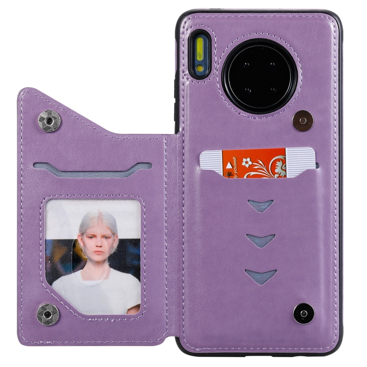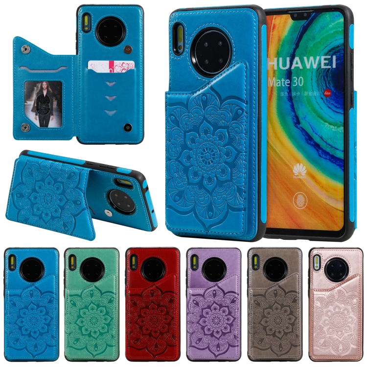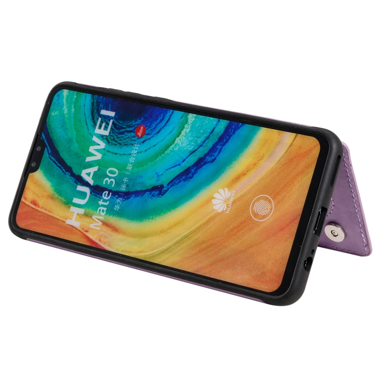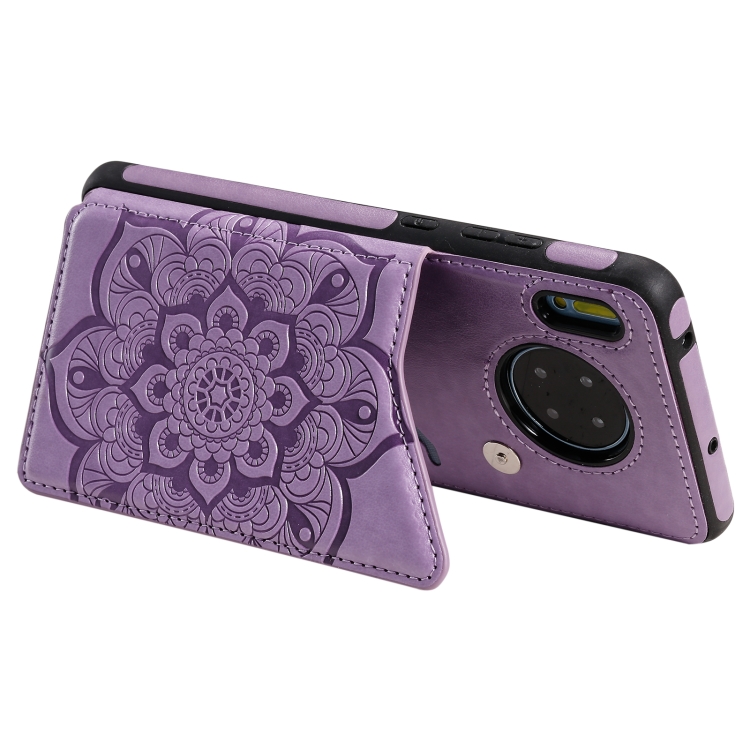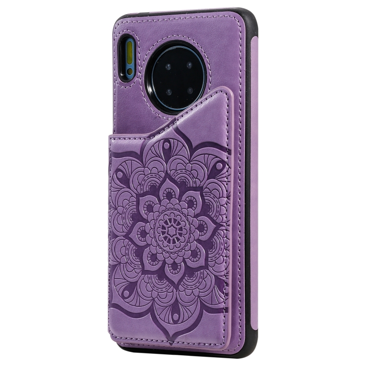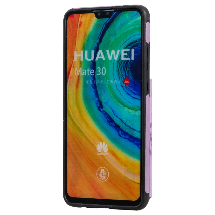 Para Huawei Mate 30 Flor Patrón de estampado en relieve Estuche protector a prueba de golpes con soporte y ranuras para tarjetas y marco de fotos (púrpura)
