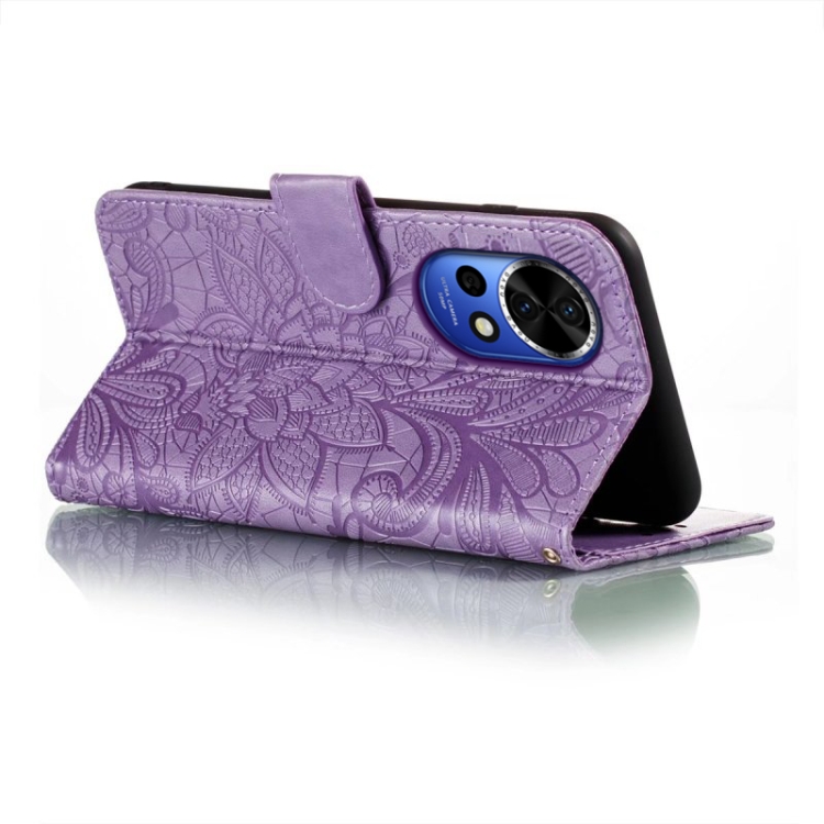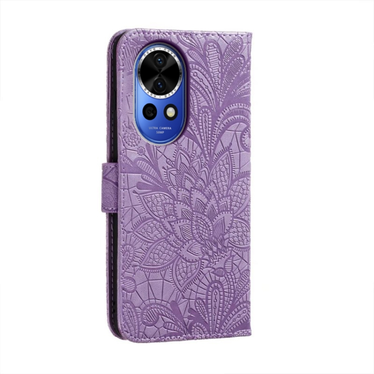 Funda de Cuero para Huawei Nova 12 con Tapa y Estampado de Flores de Encaje (Púrpura)