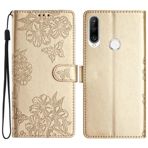 Funda para Huawei P30 Lite Cherry Blossom Butterfly Skin Feel de PU en Relieve (Oro)