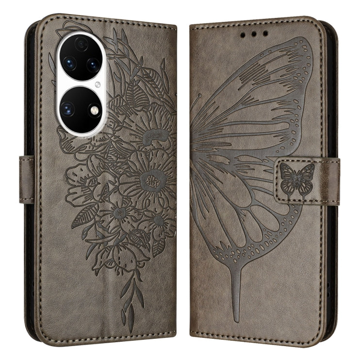 Funda de Cuero para Huawei P50 con Mariposa en Relieve (Gris)