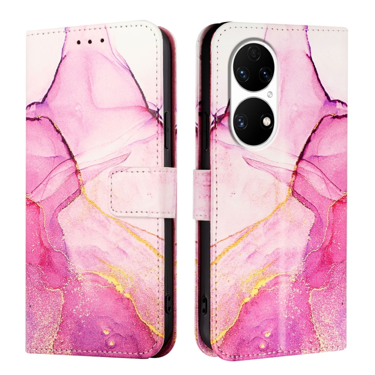 - 1x Funda de Cuero para Huawei P50 Pro Pt003 con Tapa y Patrón de Mármol (Rosa Púrpura Dorado)