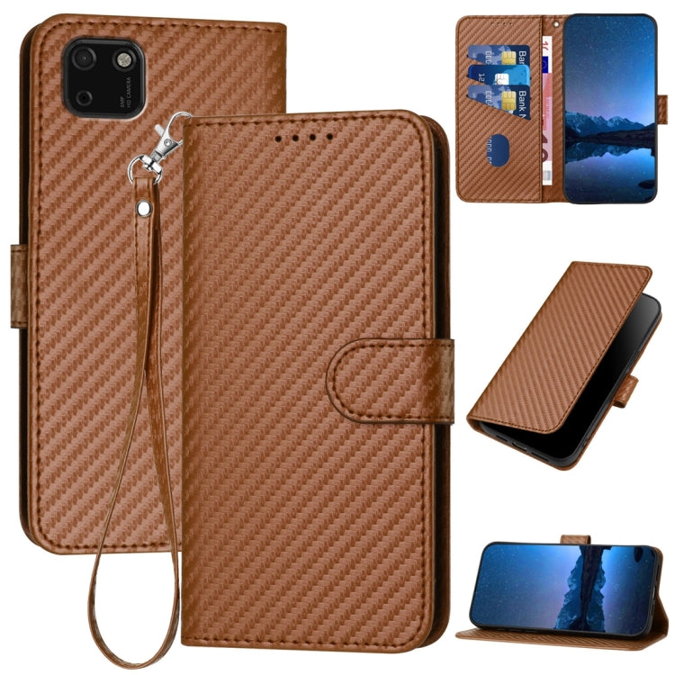 Funda de Cuero para Huawei Y5P Yx0070 con Hebilla de Fibra de Carbono y Cordón (Café)