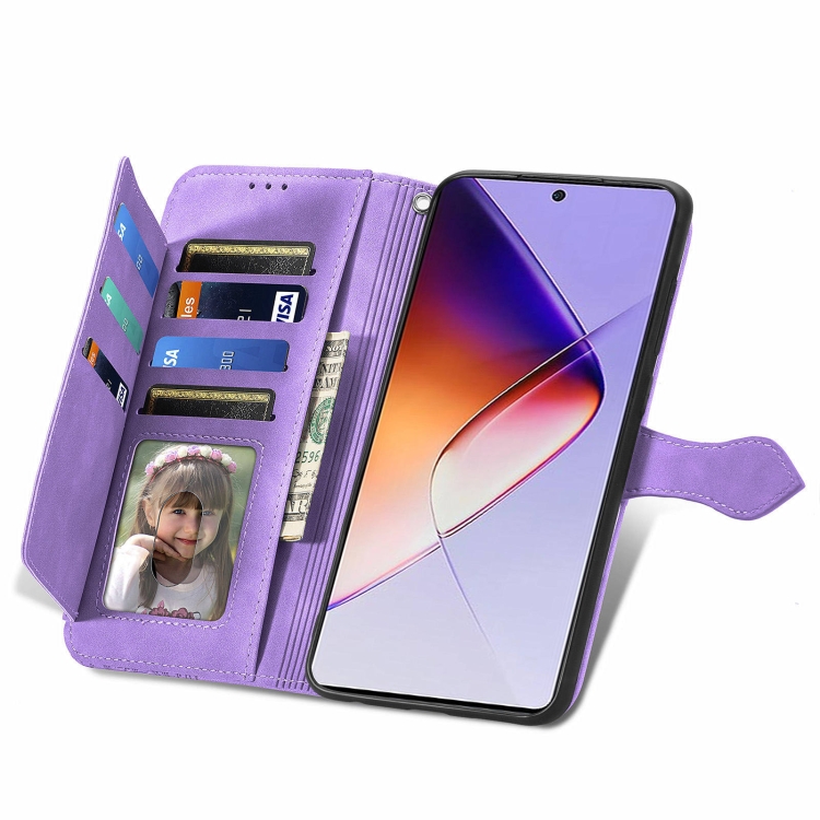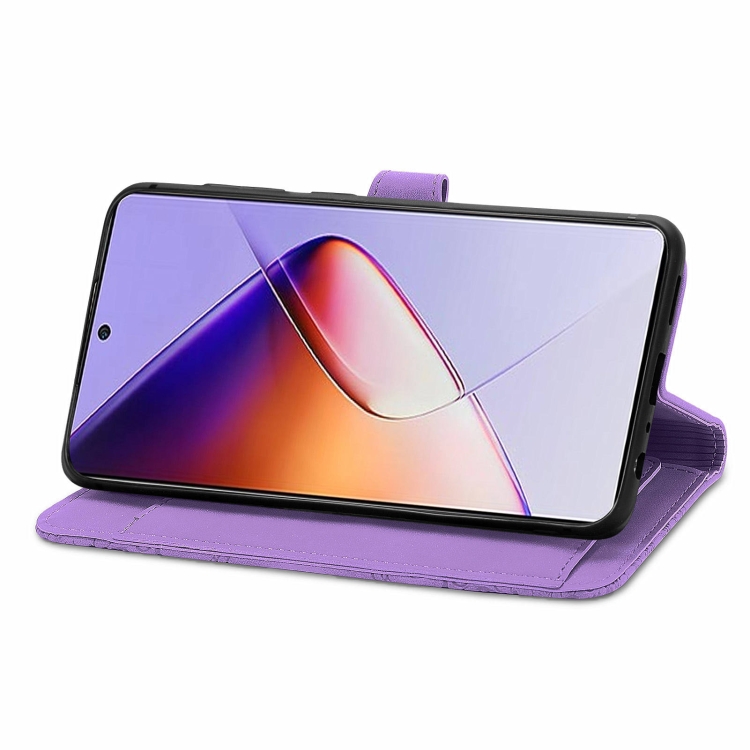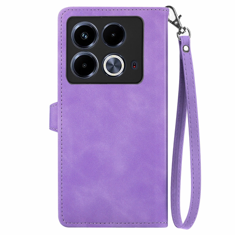 Funda de Cuero para Infinix Note 40 con Cremallera y Flores en Relieve (Púrpura)
