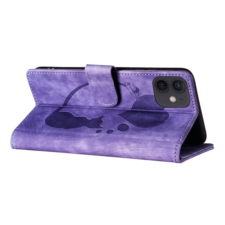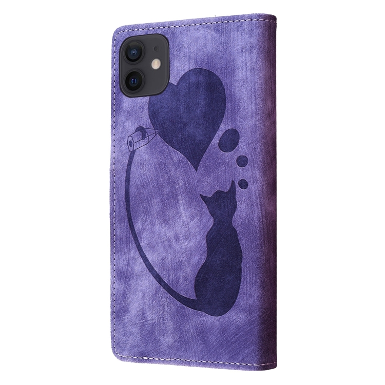 Estuche para teléfono iPhone 11 Cuero con relieve de gato y corazón (Púrpura)