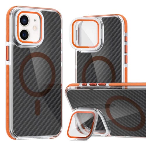 Estuche para Teléfono iPhone 12 Pro / 12 Magsafe con Película de Lente Fibra de Carbono Dos Colores y Soporte Plegable (Naranja)