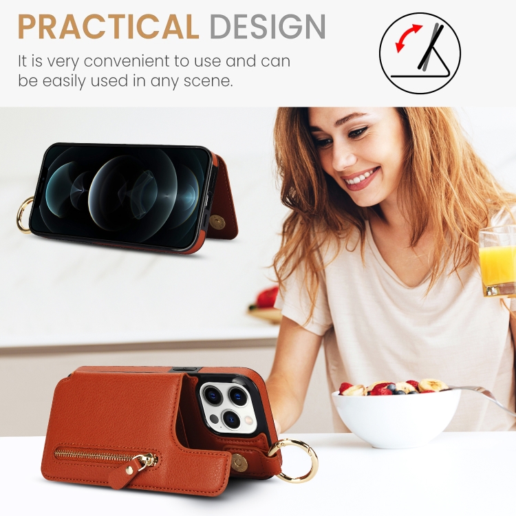 Funda para Teléfono iPhone 12 Pro Litchi Texture Zipper con Bolsa para Tarjetas y Doble Hebilla (Marrón)