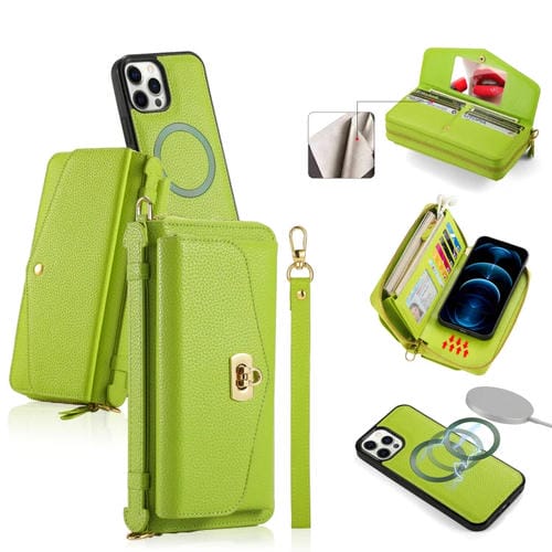 Estuche para teléfono iPhone 12 Pro Magsafe Crossbody con billetera y cremallera multifuncional de cuero Litchi (Verde)