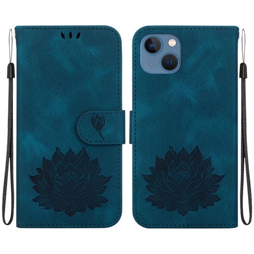 Funda de Cuero para iPhone 13 con Relieve de Loto (Azul Oscuro)