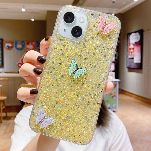 Funda para Teléfono TPU Epoxi iPhone 13 con Lentejuelas Estrelladas y Diamantes de Imitación (Amarillo)
