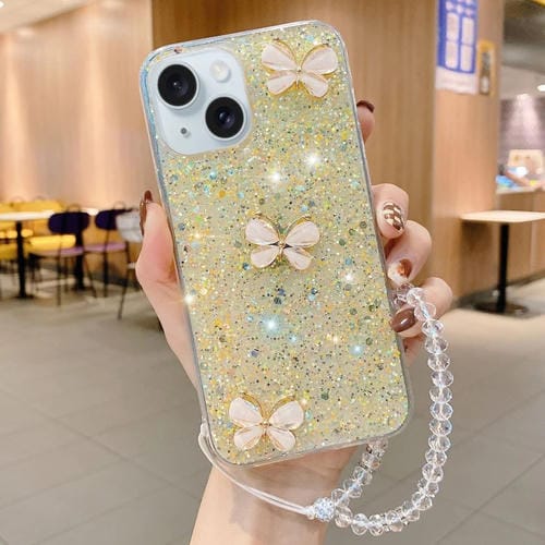 Funda para Teléfono iPhone 13 TPU Epoxi Mariposa de Jade Lentejuelas Estrelladas con Correa (Amarillo)