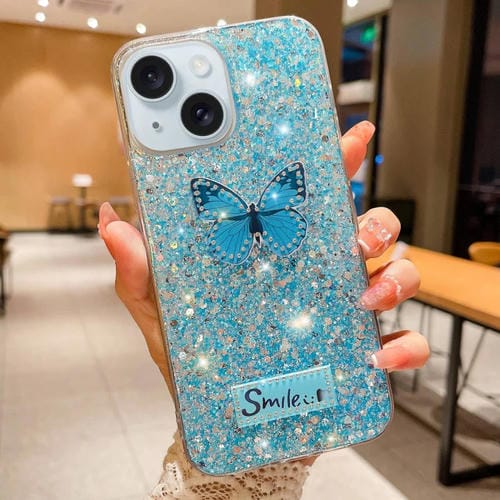 Funda para Teléfono TPU Epoxi iPhone 13 con Mariposa y Diamantes de Imitación con Lentejuelas Estrelladas (Azul)