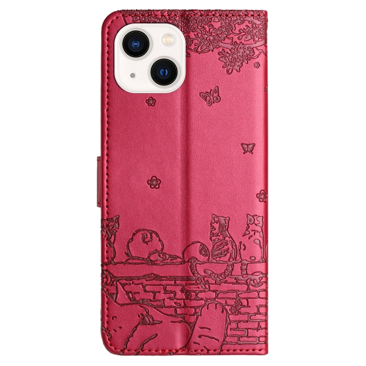 Funda de Cuero para iPhone 13 Mini Cat Relieve Patrón con Cordón (Rojo)