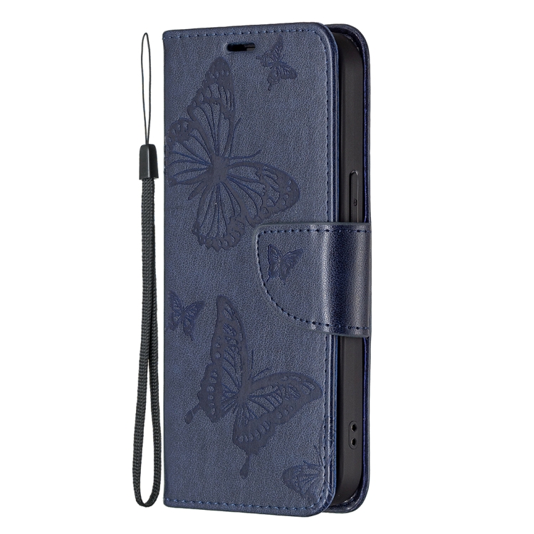 Funda para iPhone 13 Mini Cuero PU Estampado Mariposas Tapa Horizontal Soporte Ranura Tarjeta Billetera Cordón (Azul)