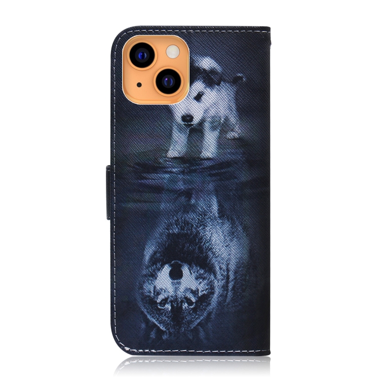 Estuche de Cuero para iPhone 13 Mini con Tapa Horizontal, Soporte, Ranuras para Tarjetas y Billetera (Lobo y Perro)