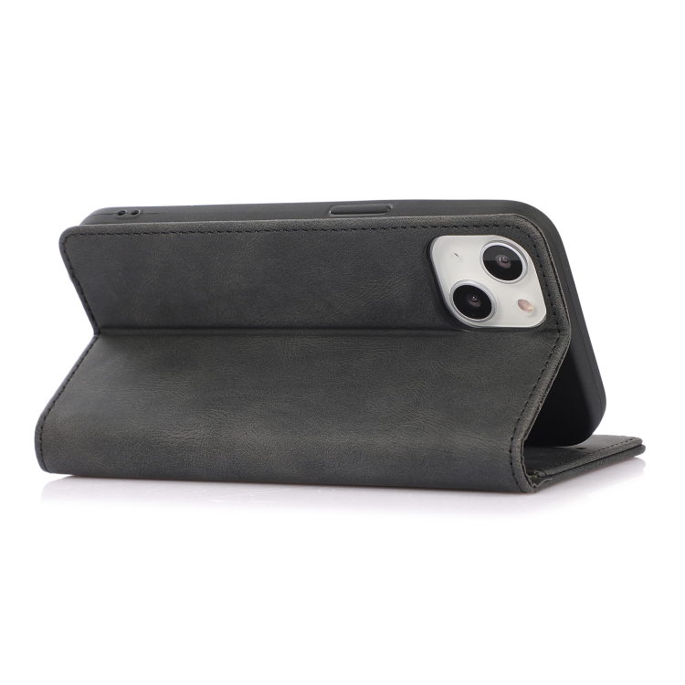 Funda para iPhone 13 Mini Cuero Tapa Horizontal Textura Caballo Loco Magnético Soporte Ranuras Tarjetas Billetera (Negro)