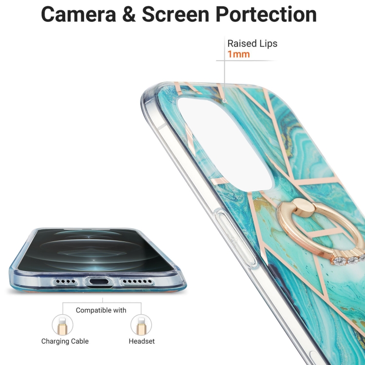 Funda para iPhone 13 Mini Galvanoplastia Empalme Patrón de Mármol TPU Doble Cara con Soporte para Anillo (Azul)
