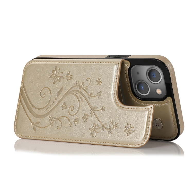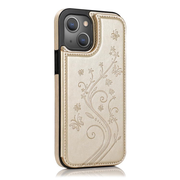 Funda protectora para iPhone 13 Mini Mariposas Flores Doble Hebilla PU + TPU con Soporte Ranuras para Tarjetas y Marco de Fotos (Dorado)