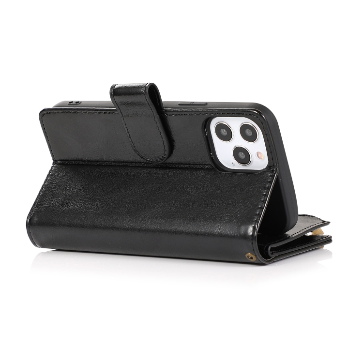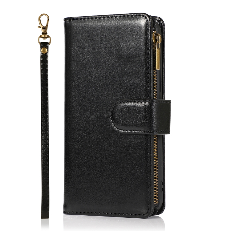 Funda para iPhone 13 Mini Crazy Horse Texture Cuero Tapa Horizontal 9 Ranuras Soporte Billetera Cremallera Cordón (Negro)