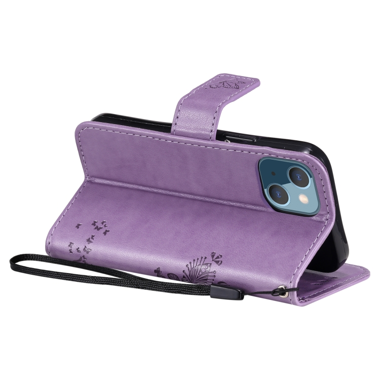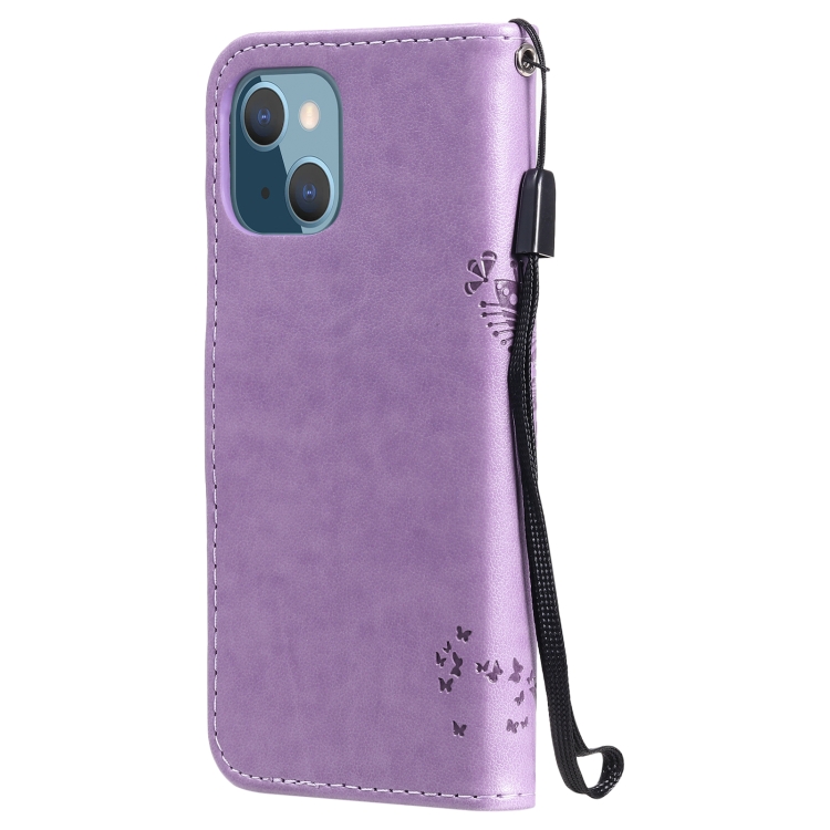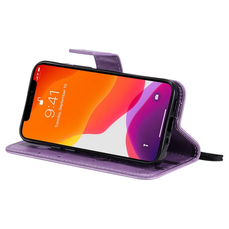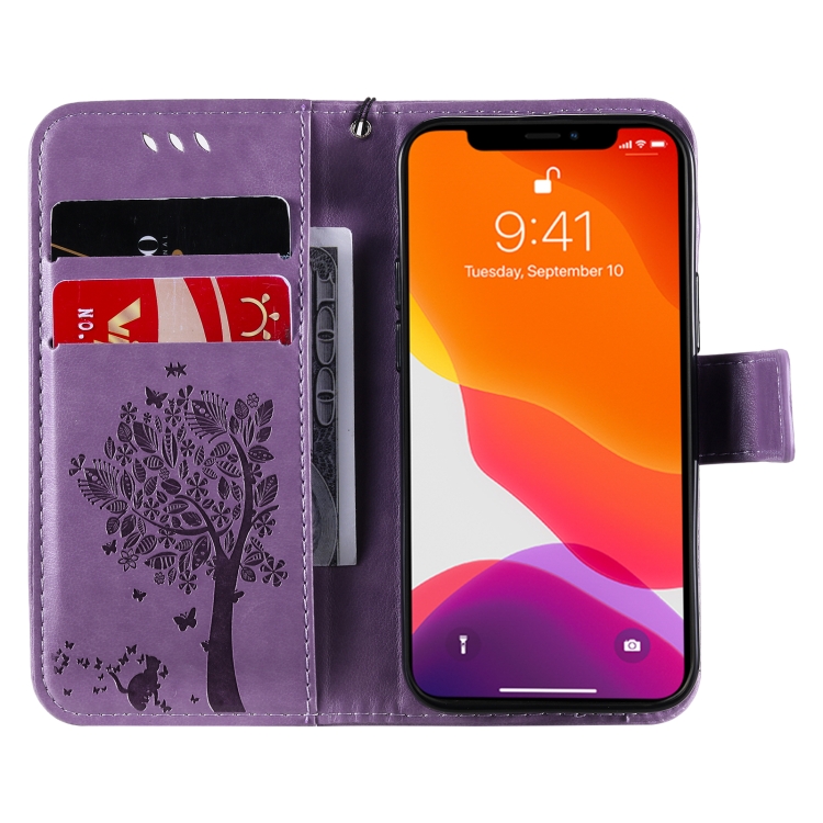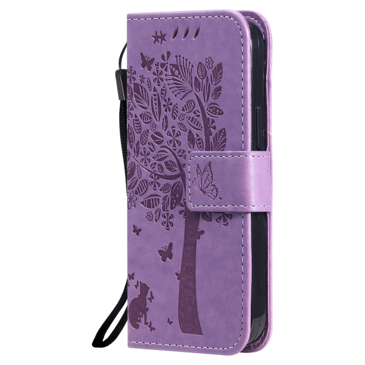 Funda para iPhone 13 Mini Cuero de PU con Patrón Árbol y Gato, Tapa Horizontal, Soporte, Ranuras para Tarjetas y Billetera (Púrpura Claro)