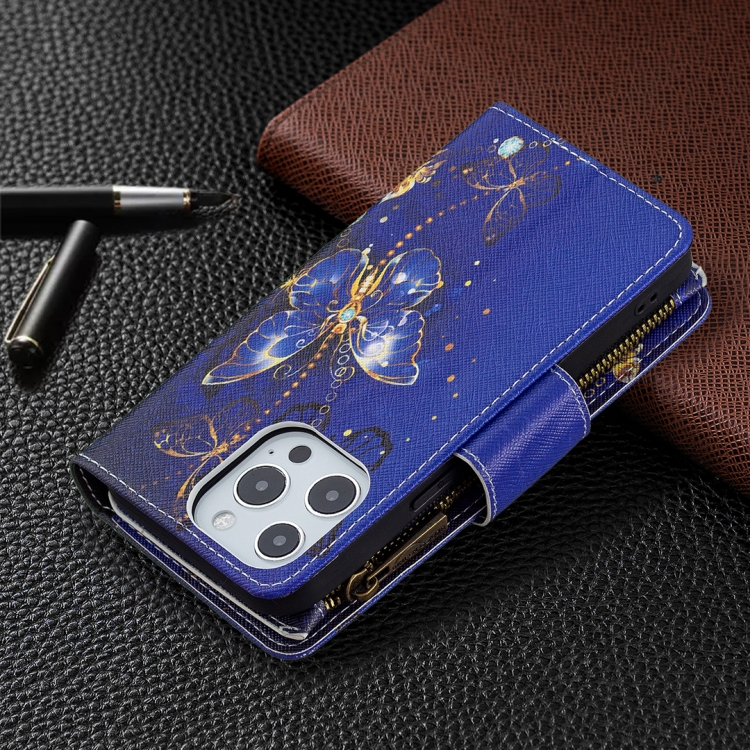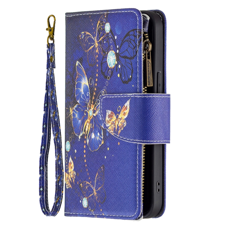 Funda de Cuero iPhone 13 Mini Patrón Dibujo Color Cremallera Tapa Horizontal Soporte Ranuras Tarjetas Billetera (Mariposa Púrpura)