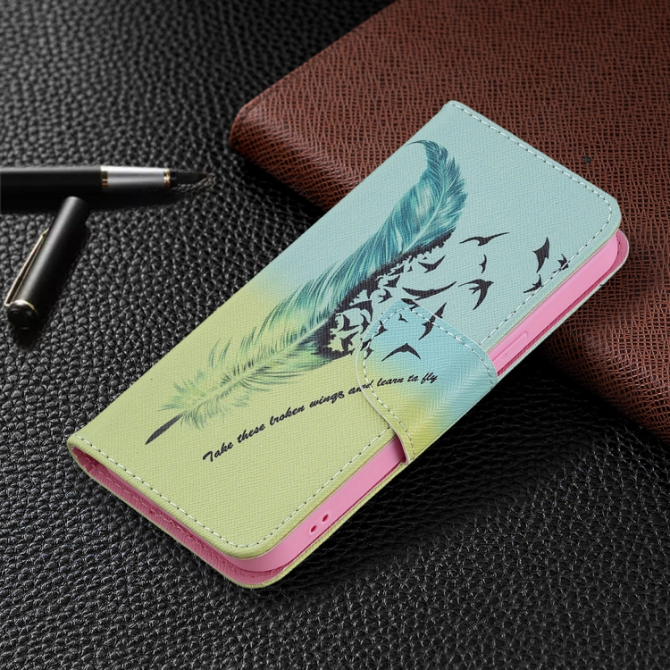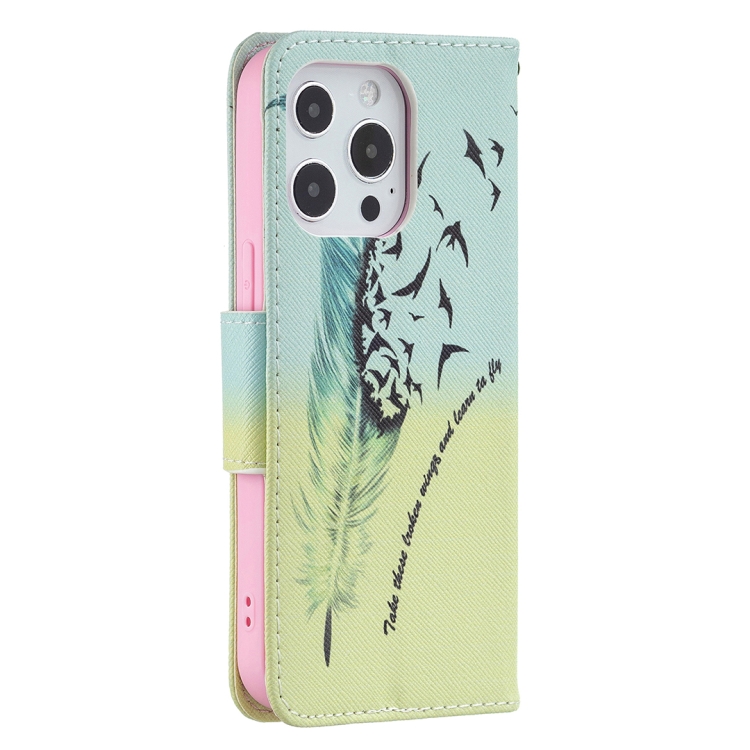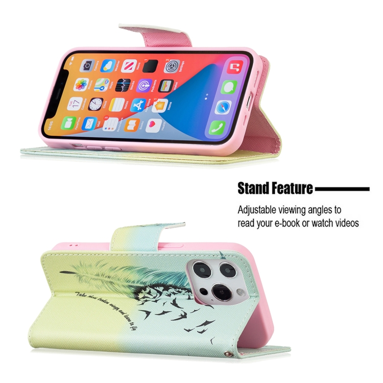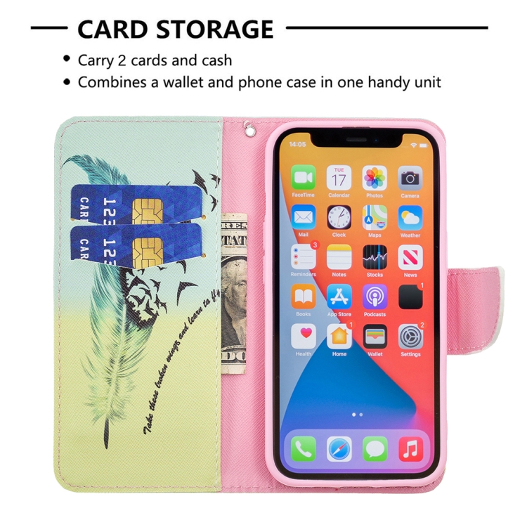 Funda de Cuero para iPhone 13 Mini con Patrón de Dibujo Coloreado, Tapa Horizontal, Soporte y Ranuras para Tarjetas y Billetera (Pluma)