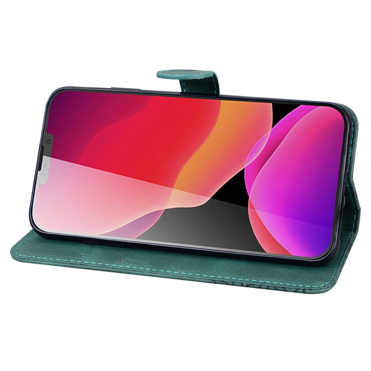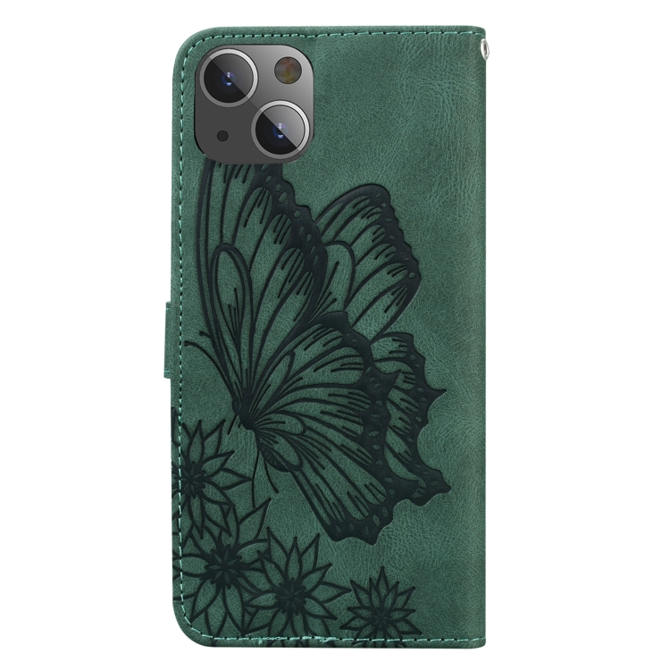 Funda para iPhone 13 Mini Retro Skin Feel Butterflies Relieve Cuero con Tapa Horizontal Soporte y Ranuras para Tarjetas y Billetera (Verde)