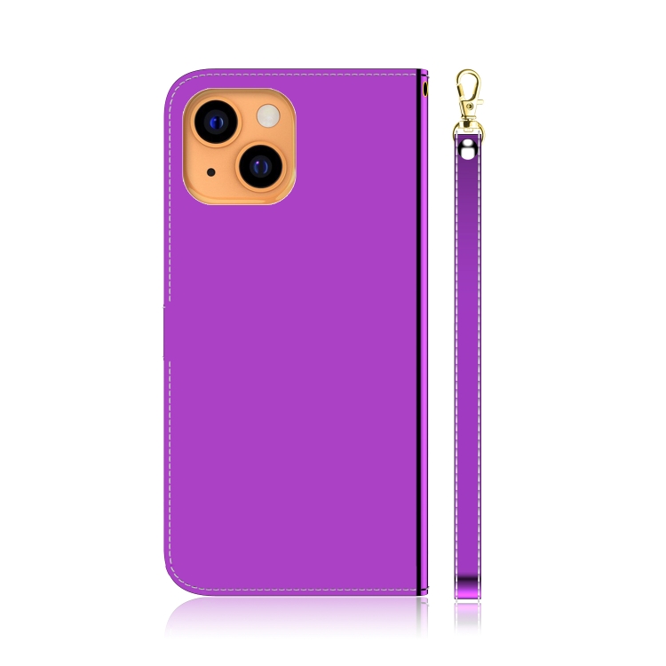 Estuche de Cuero para iPhone 13 Mini con Superficie de Espejo, Tapa Horizontal, Soporte, Ranuras para Tarjetas, Billetera y Cordón (Púrpura)