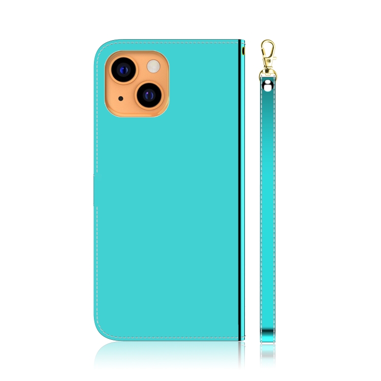 Funda de Cuero para iPhone 13 Mini Superficie de Espejo con Tapa Horizontal Soporte Ranuras para Tarjetas Billetera y Cordón (Verde Menta)