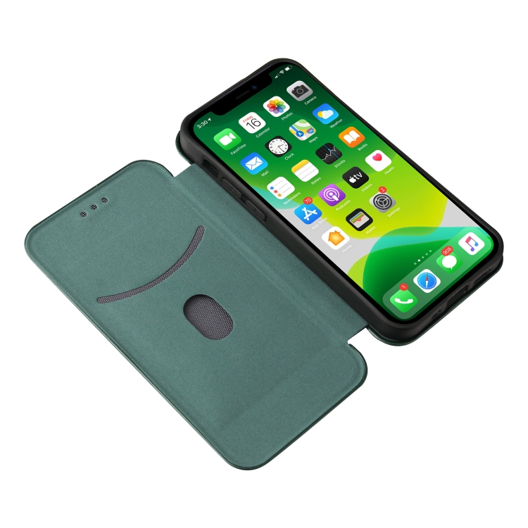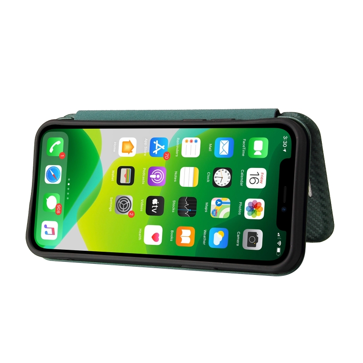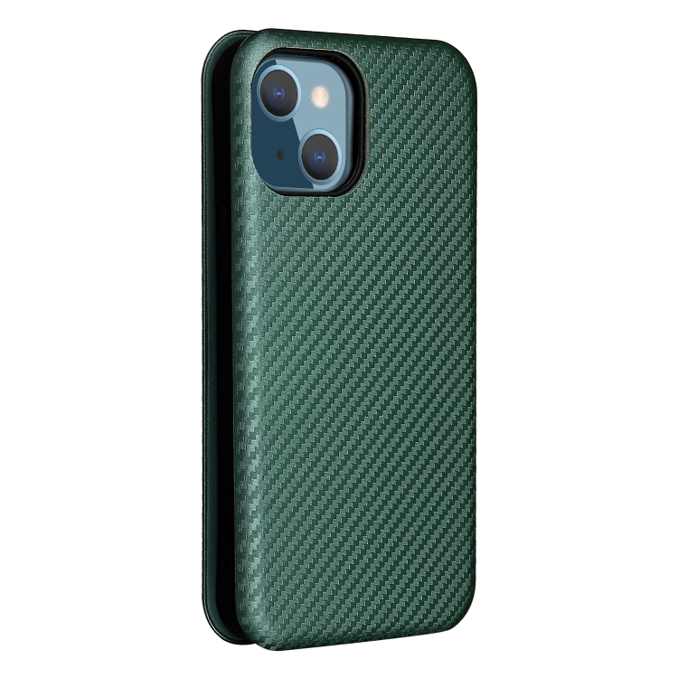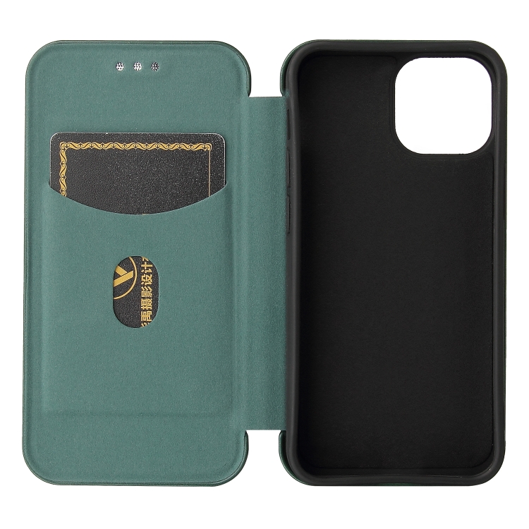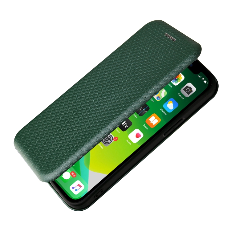 Funda para iPhone 13 Mini Textura de Fibra de Carbono Flip Horizontal TPU PC y Cuero PU con Ranura para Tarjeta (Verde)