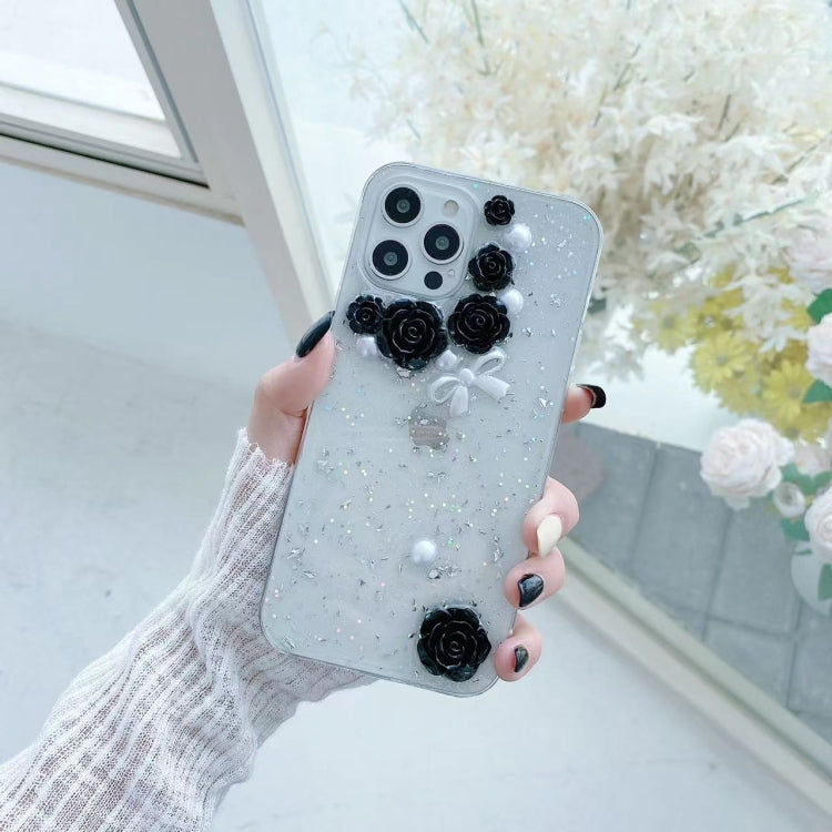 Funda para iPhone 13 Pro 3D Pearl Bow Rose Glitter Epoxy TPU (Negro)
