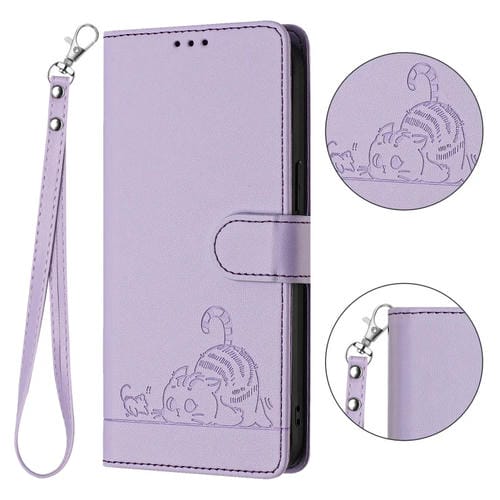 Estuche para Teléfono iPhone 13 Pro Max Cat Rat Patrón En Relieve Rfid Pu con Correa para Muñeca (Púrpura)