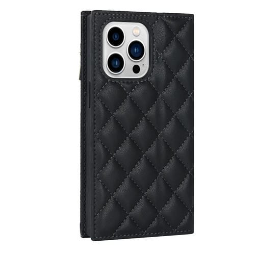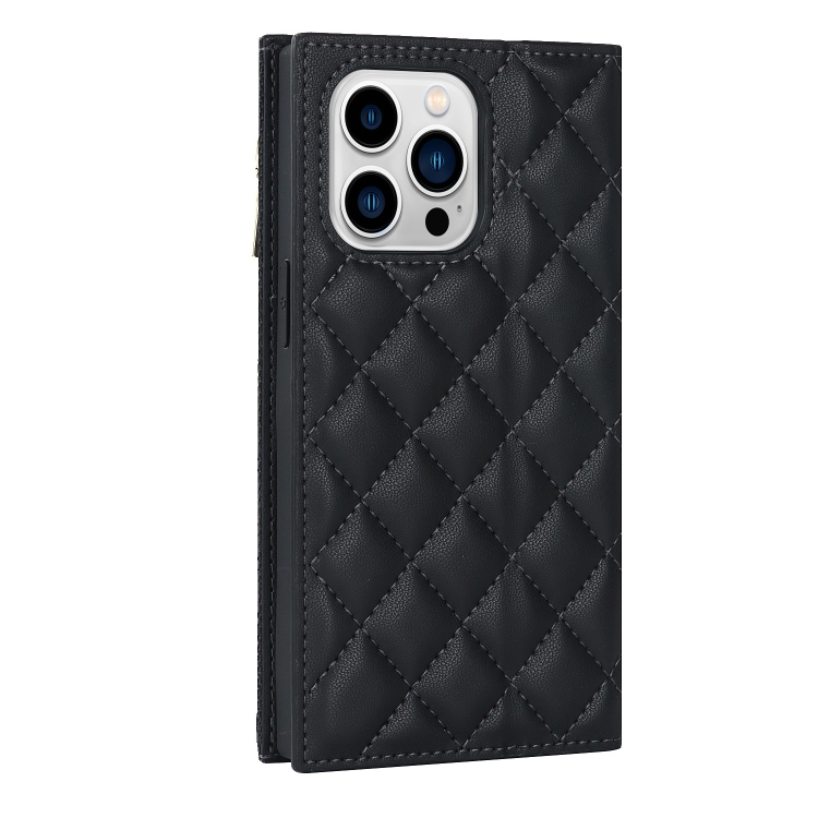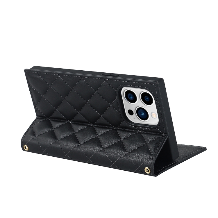 Funda para iPhone 13 Pro Max Grid Texture Lanyard de Cuero con Cremallera (Negro)