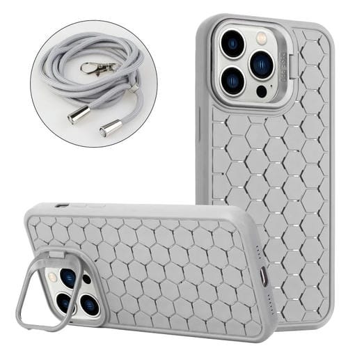 Funda para teléfono TPU Honeycomb Radiating Holder para iPhone 13 Pro Max (Gris) con cordón