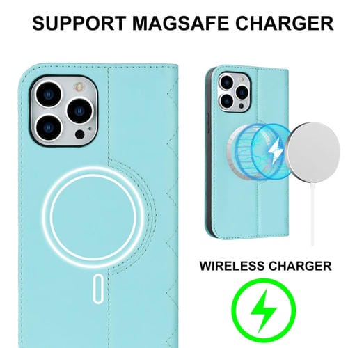 Funda para iPhone 13 Pro Max Rhombic Magsafe Rfid Antirrobo Cuero (Azul Cielo)