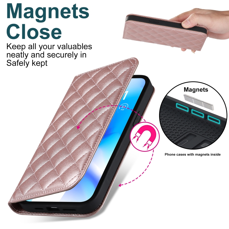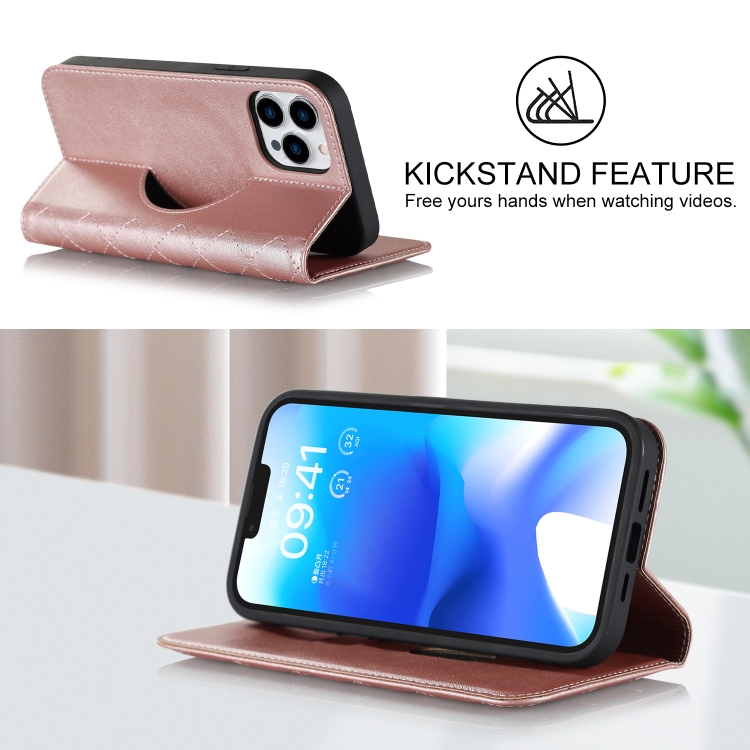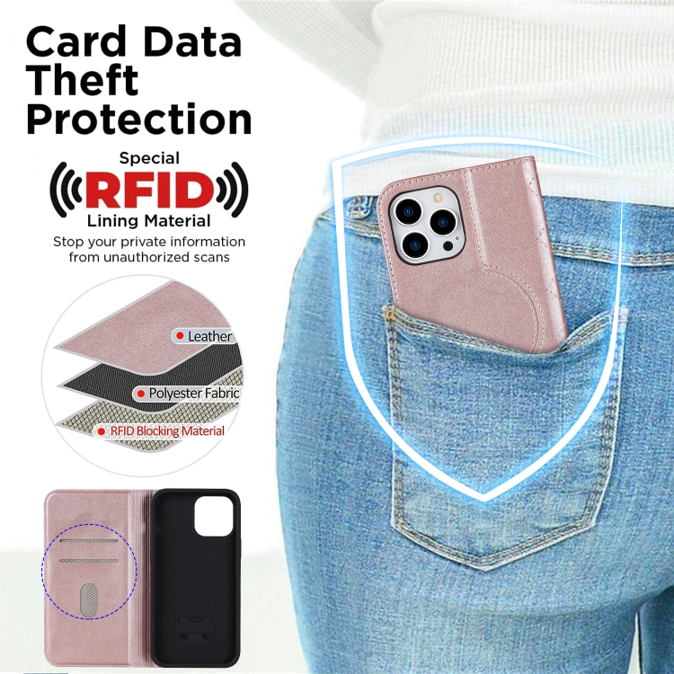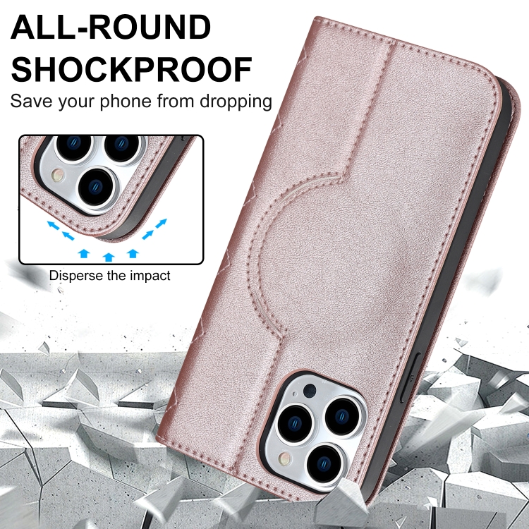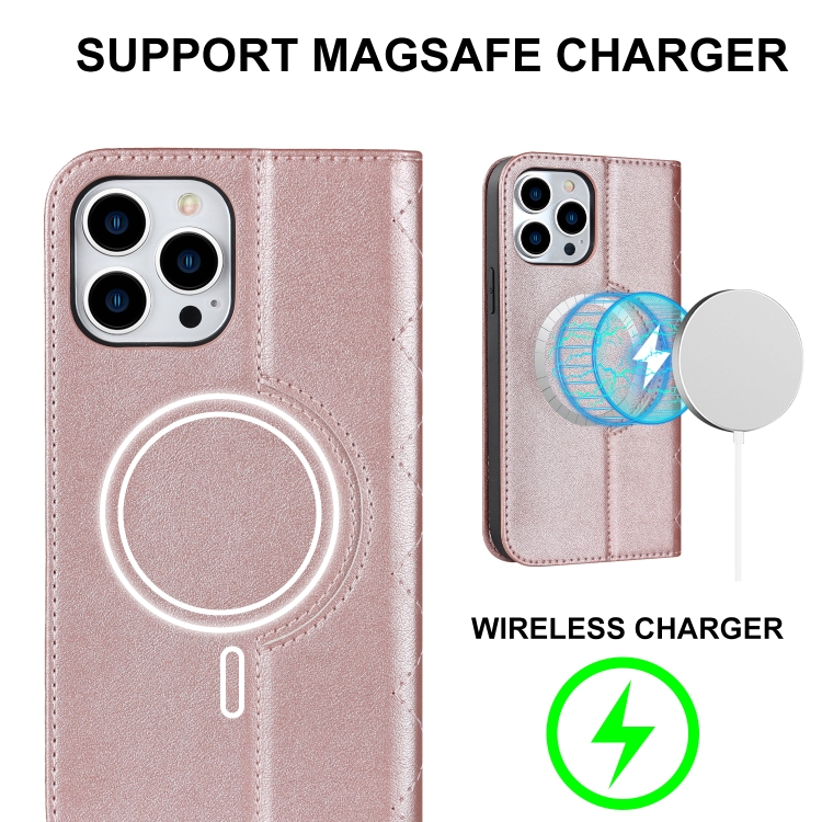 Funda para iPhone 13 Pro Max Rhombic Magsafe Rfid Antirrobo Cuero Tipo Billetera (Oro Rosa)